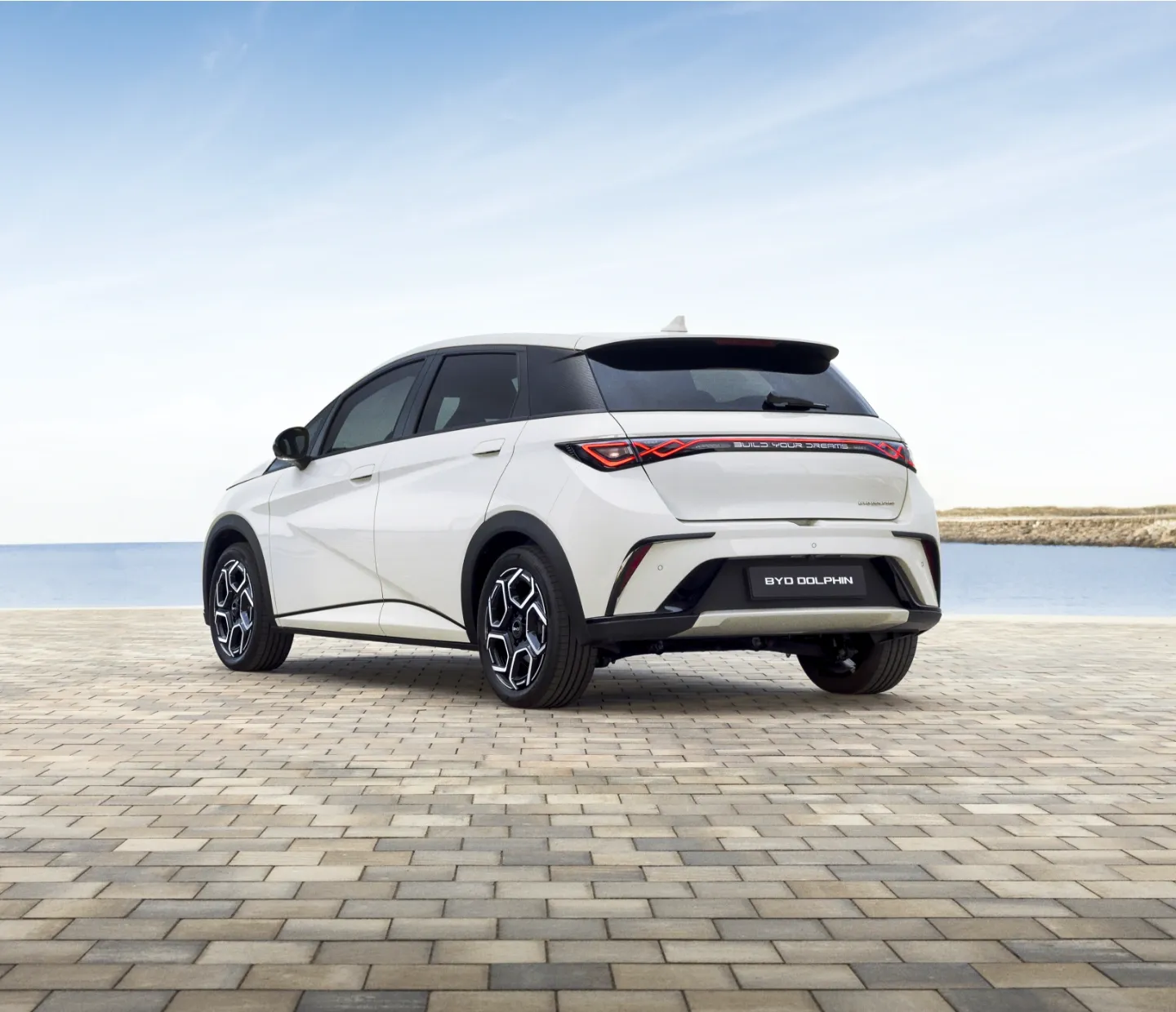 O design exterior do BYD DOLPHIN inspirou‑se na profunda observação e estudo do oceano, traduzindo‑se no conceito “ocean aesthetics”. A sofisticação está presente desde a dianteira à traseira, combinando linhas de contorno fluído com pormenores vincados, essencialmente nas laterais, atribuindo uma personalidade confiante e elegante. A faixa dianteira de iluminação de LED contínua, na grelha central, que une os dois faróis dianteiros, e o design dinâmico dos faróis traseiros, reforçam a alma e o estilo deste citadino elétrico.